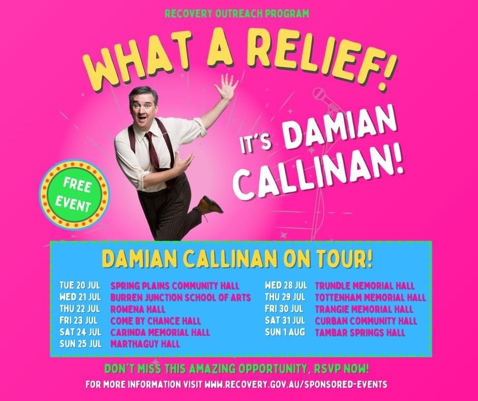 Join comedian Damian Callinan for the FREE What a Relief event at the Spring Plains Community Hall. RSVP - Lara Seccombe 0497 227 483 / [email protected]