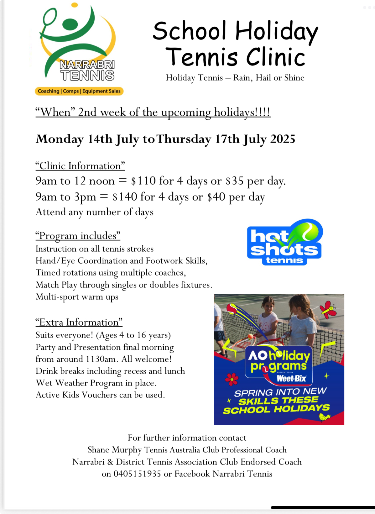 Looking for something for your sporty child to do this school holidays. This tennis clinic will let your child hone their tennis skills while having fun. There are half and …